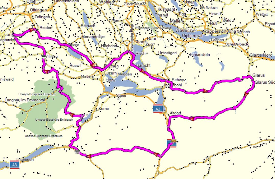 Route: Langenthal – A2 – Schwyz – Muotathal – Pragelpass – Schwammhöhe – Glarus – Klausenpass – Altdorf – Sustenpass – Innertkirchen – Brünig – Glaubenbergpass – Rengg – Wohlhusen – Menzberg – Willisau – Langenthal