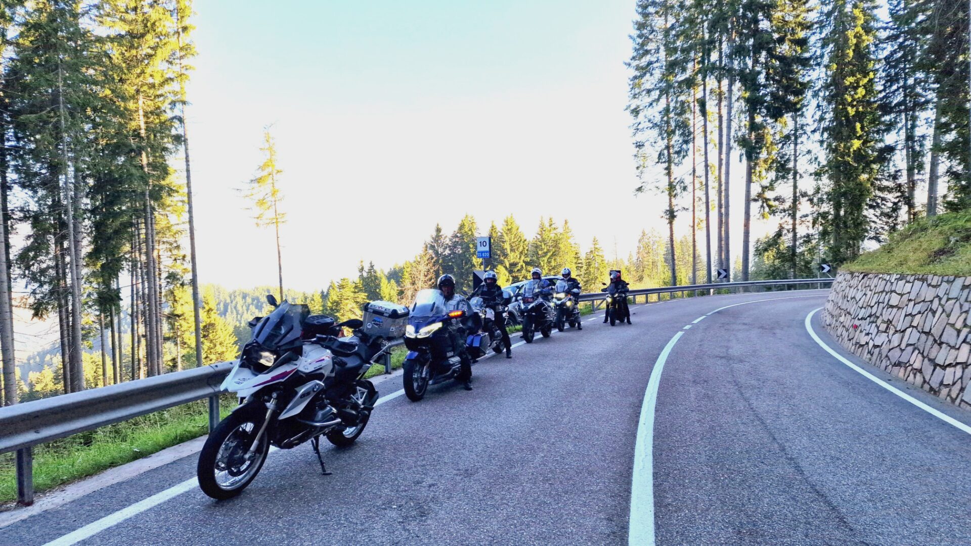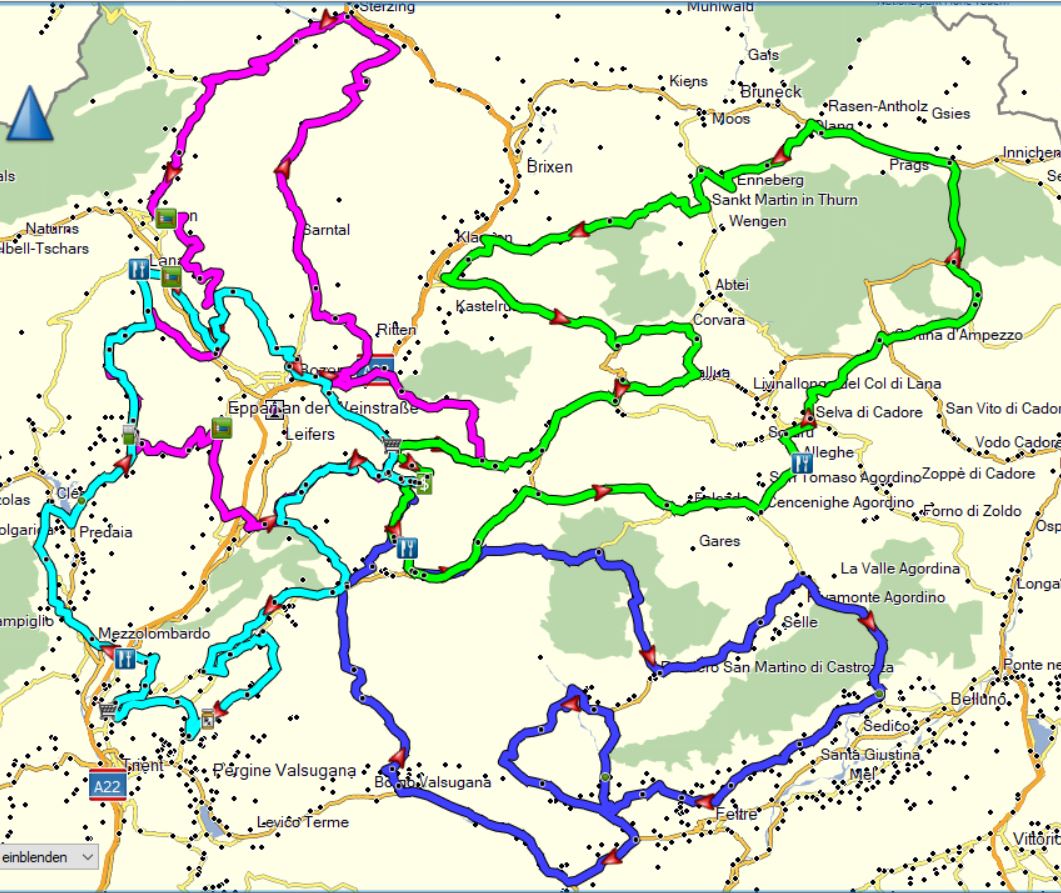 1. Tour: Obereggen – Passo Lavazè – Stava – Pozza di Fassa – Passo san Pelelegrino – Lago di Alleghe – Passo Giau – Cortina – Lago di Misurina – Toblach – Furkelpass – Sankt Martin in Thurn – SP163 – Lajen – SS242 – Grödnerjoch – Varda – Passo Pordoj – Vigo di Fassa – Karerpass – Obereggen – 370km